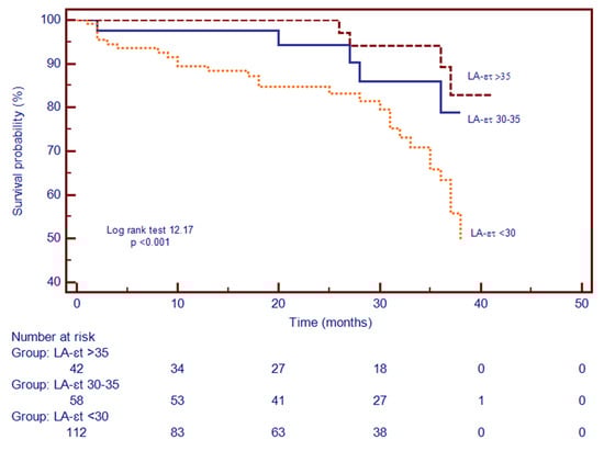 Patients were divided in three subgroups based on the LA function and according to LA-εt tertiles, to evaluate if the severity of LA phasic dysfunction impacts the prediction of the composite outcome. Hence, 42 patients had mild impairment of LA-εt > 35% (tertile 1), 58 patients had moderate impairment of LA-εt 30–35% (tertile 2) and 112 patients had severe impairment of the LA-εt < 30% (tertile 3). Kaplan–Meier analysis demonstrated that patients with LA-εt < 30% had a higher risk for the composite outcome. Additionally, during the follow-up period, the composite outcome occurred in 25.9% of patients with LA-εt < 30% (tertile 3), while occurrence in the other two categories was lower (Figure 3).