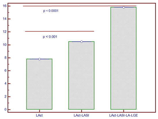 Stepwise Cox proportional-hazards models showed that these parameters had considerable predictive value for the composite outcome (Figure 4). Foremost, the addition of LASI to LA-εt significantly increased the predictive ability (Chi-square = 10.2, p < 0.001), while the further addition of LA-LGE to them enhanced it even more (Chi-Square = 15.8; p < 0.0001).