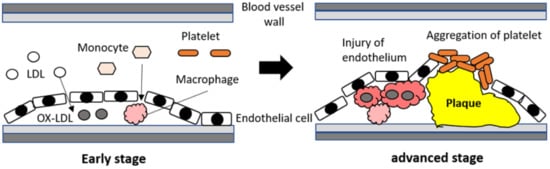 While discussing the pathological mechanisms of vasculogenic ED, it is important to discuss the endothelial dysfunction caused by lipid metabolism disorder in blood vessels [16,17]. In particular, low-density lipoprotein (LDL) abnormalities are a well-known key factor in the development of endothelial dysfunction in various vascular diseases, such as atherosclerosis [18,19]. Furthermore, macrophages play an important role in abnormal LDL-related vascular damage by stimulating plaque formation [19]. Oxidized LDL (ox-LDL) promotes atherosclerosis and increases the risk of cardiovascular diseases [20,21]. Moreover, ox-LDL can affect the activities and phenotypes of macrophages by regulating cytokine production, inflammation, and lipid uptake [15,21,22,23]. Thus, the interaction between ox-LDL and macrophages is a key factor in the progression of endothelial injury. A simple schematic of the pathological roles of ox-LDL and macrophages in endothelial dysfunction and vascular damage is shown in Figure 1.