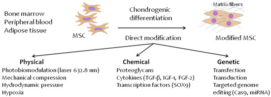 An additional way to affect MSCs is genetic modification of cells to stimulate the synthesis of necessary growth or transcription factors [218,219]. Gene modification of cells allows one to control not only chondrogenic differentiation, but also to obtain cells with enhanced production of ECM proteins, which is an important condition to ensure that the resulting regenerate is close in biomechanical properties to native hyaline cartilage.