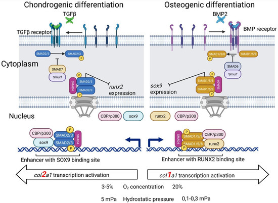 The cartilage ECM is characterized by a high-water content (up to 80%) [151] and low permeability, and consequently, exposure to load creates hydrostatic pressure (HP), which varies depending on the intensity of physical activity from 2 to 18 MPa [141,152]. The physiological levels of HP (5 MPa) significantly enhance the synthesis of the cartilage matrix [152,153], a high hydrostatic pressure (25 MPa) induces proosteoarthritic effects (Col II and aggrecan inhibition, increased expression of metalloproteinases and their synthesis) [154], while a low hydrostatic pressure (100–300 kPa) promotes osteogenic differentiation (increased expression of Runx2, ALP, and osteopontin) [155], resulting in bone tissue from MSCs rather than normal hyaline cartilage being formed (Figure 2).