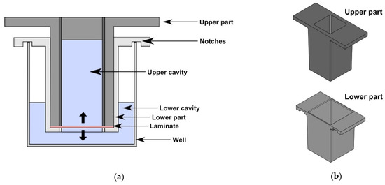 The sample holder was further improved in an iterative process. The laminate supporting surface of the lower part was adjusted and its edges were phased to enhance the positioning of the laminate. Furthermore, notches were added to the wings of the lower part to enhance the positioning of the sample holder in the well. The dimensions of the sample holder can be found in Figures S1 and S2.