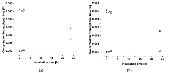 Proof of tightness of the sample holder. The sample holder was fabricated by additive manufacturing from a standard transparent resin. A two-layer collagen laminate consisting of Collagen Solutions and Atelocollagen was placed in the sample holder. The tightness of the sample holder was demonstrated by analyzing the diffusion of bromophenol blue from the upper cavity (squares) into the lower cavity (dots). (a) Concentration of bromophenol blue in a setup with a collagen laminate. (b) Concentration of bromophenol blue in a setup with a collagen laminate supported by a layer of parafilm.