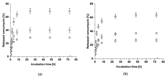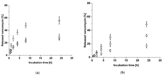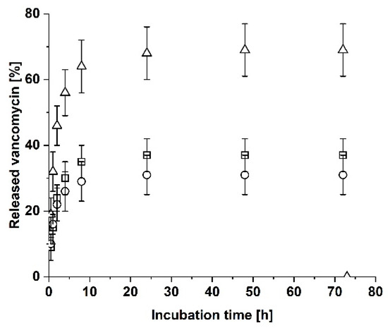 The glycopeptide vancomycin is used as an effective antibiotic against gram-positive bacteria, such as Staphylococcus aureus [11]. Since Staphylococci are the main pathogens that cause surgical site infections, vancomycin is frequently used to prevent the infection of surgical wounds [12,13]. One advantage of vancomycin is its compatibility for administration to patients with a β-lactam allergy [13]. Lopez et al. showed that different biocompatible layered double hydroxides as complexes with vancomycin are able to release vancomycin [14]. Silk fibroin nanoparticles containing vancomycin in silk scaffolds are also able to deliver vancomycin, as described by Hassani Besheli et al. [15]. Vancomycin has also been used to impregnate collagen/hydroxyapatite layers coated on titanium implants to prevent infections and improve implant integration into the bone [16]. Hartinger et al. showed that natural biomaterials such as collagen, which was crosslinked by carbodiimide, can also be used for the controlled release of vancomycin [17].