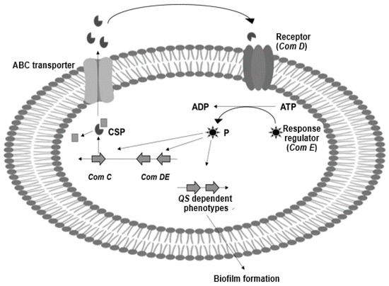 Using S. mutans as a bacterial model to explain its pathogenicity caused during dysbiosis, Figure 1 shows how this bacterium activates quorum sensing to control biofilm production and other virulence factors [7,8]. ComCDE secretes a competent stimulating peptide (CSP), acting also as a signal molecule; ComC synthesizes this peptide, and it is recognized and phosphorylated by the transmembrane histidine kinase (ComD) and its response regulator (ComE) [8]. The phosphorylated peptide activates the signaling cascade, expressing different genes involved to synthesize proteins and enzymes that S. mutans use to adhere to dental surfaces and form biofilms.