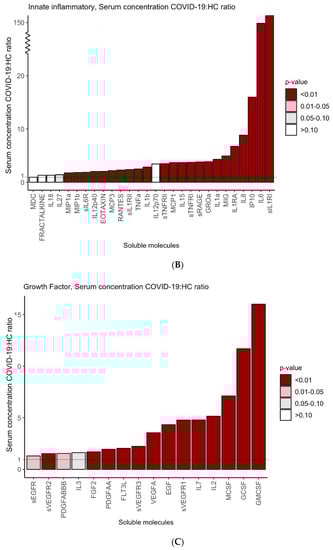 Serum levels of cytokines and growth factors in COVID-19 patients and HC. Y axes indicate the ratios of concentrations of each cytokine in the COVID-19 patients to those in HC. Ratios for adaptive IR-related cytokines (A), innate inflammatory-related IR cytokines (B) and growth factors (C). The vertical bars represent the mean of the COVID-19:HC ratios for the indicated molecule. The intensity of color denotes significant differences between serum levels of each cytokine in the COVID-19 patients and HC.