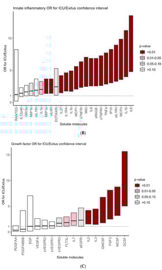 Odds ratios for ICU/Exitus of serum levels of adaptive IR-related cytokines (A), innate inflammatory IR-related cytokines (B) and growth factors (C) in COVID-19 patients. Y axes show the odds ratio of increased concentrations of each marker for ICU/Exitus. The intensity of the color grades the level of the significance of the odds ratio.