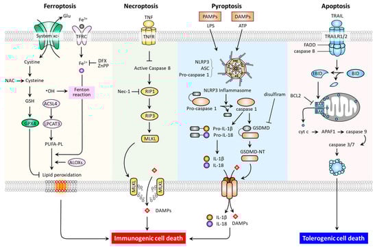 Molecular pathways and immunogenic properties of ferroptosis, necroptosis, pyroptosis, and apoptosis. ACSL4, acyl-CoA synthetase long chain family member 4; ALOXs, arachidonate lipoxygenases; ASC, apoptosis-associated speck-like protein containing a CARD (ASC); LPCAT3, lysophosphatidylcholine acyltransferase 3; TFRC, transferrin receptor; APAF-1, apoptotic peptidase activating factor 1; BAK, Bcl-2 homologous antagonist/killer; BAX, Bcl-2-associated X; BCL2, B-cell lymphoma 2; BID, BH3 interacting domain death agonist; DFX, deferoxamine; tBID, truncated BH3 interacting domain death agonist; FADD, Fas-associated protein with death domain; GSDMD, gasdermin D; MLKL, mixed lineage kinase domain-like pseudokinase; Nec-1, necrostatin-1; NLRP3, Nod-like receptor 3; RIP1, receptor-interacting protein kinase 1; RIP3, receptor-interacting protein kinase 3; TNF, tumor necrosis factor; TNFR, tumor necrosis factor receptor; TRAIL, tumor necrosis factor-related apoptosis-inducing ligand; TRAILR1, tumor necrosis factor-related apoptosis-inducing ligand receptor 1.