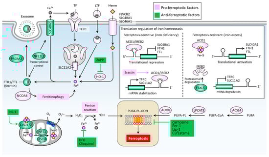 Iron regulatory proteins, including aconitase 1 (ACO1) and iron-responsive element binding protein 2 (IREB2), play central roles in regulating cellular iron homeostasis at the posttranscriptional level. ACO1 is a Fe-S cluster protein that exists in two forms. When a cell is rich in iron, ACO1 exists in the form of cytoplasmic aconitase. When intracellular iron is lacking, ACO1 presents in the Fe-S cluster as a regulator of translation. Unlike ACO1, IREB2 is mainly regulated by F-box and leucine-rich repeat protein 5 (FBXL5)-mediated protein degradation. IREB2 undergoes degradation when iron is excessive and stabilizes when iron is lacking [68] (Figure 2). In the context of erastin-stressed cell death, IREB2 can relay the pro-ferroptosis effect by altering genes accounting for iron metabolism [69]. Mechanistically, ACO1/IREB2 acts to target the iron-responsive elements (IREs) which are conserved hairpin structures located in the untranslated regions (UTRs) of mRNAs. The main iron-regulating mRNAs can be regulated by ACO1/IREB2, including the genes involved in iron import (e.g., TFRC and SLC11A2), storage (e.g., FTH1 and FTL), and export (e.g., SLC40A1). Interestingly, the binding of ACO1/IREB2 to IREs located in the 5′ UTR and 3′ UTR has the opposite effect. The binding of ACO1/IREB2 to 5′ IRE leads to the inhibition of translation of mRNA; whereas the binding to 3′ IRE causes the promotion of translation of mRNA by inhibiting the degradation of mRNA. As shown in Figure 2, under the condition of iron deficiency, ACO1/IREB2 binds to the 3′ IREs of TFRC and SLC11A2 mRNAs, and the 5′ IREs of SLC40A1 and FTH1/FTL mRNAs. As a result, ACO1/IREB2 decreases the synthesis of TFRC and SLC11A2, while it increases the synthesis of SLC40A1 and FTH1/FTL mRNAs. On the other hand, an excess of cytosolic iron results in translational inhibition of TFRC and SLC11A2, and translational activation of SLC40A1 and FTH1/FTL [70]. Ferroptosis can be regulated by several transcription factors that control the transcription activity of genes involved in iron metabolism [71]. For instance, nuclear factor erythroid 2 like 2 (NFE2L2, also known as NRF2) plays a primary role in the anti-ferroptotic effect by up-regulating genes responsible for iron storage, such as FTH1/FTL [71,72] and SLC40A1 [73].