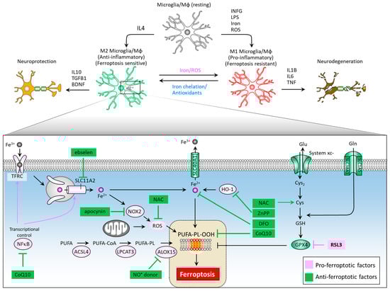Intracellular iron levels modulate differentiation towards one or the other phenotype [110]. An iron overload triggers M1 polarization via an ROS-mediated mechanism [111], increasing TNF and IL1B secretion [112], and causes M2 macrophages to switch their phenotype to M1 [113]. Iron chelator deferoxamine reduces ROS levels and TNF and IL1B secretion by microglia [114] and also promotes microglial M2 polarization neurodegeneration in animals [115]. Kapralov et al. revealed that M1 microglia are resistant to ferroptotic stress, while M2 are more sensitive [116]. M2 microglia express remarkably lower levels of inducible nitric oxide synthase (iNOS) than M1 microglia. Specifically, the ferroptotic resistance of M1 microglia requires iNOS/NO•, while NO• empowers the resistance of M2 microglia to ferroptosis. The activation of nuclear factor kappa B (NFκB), a master transcription factor of neuroinflammation, serves to enhance the expression of SLC11A2, contributing to iron accumulation in dopaminergic neurons [117]. Of note, ebselen, a SLC11A2 inhibitor was noted to reduce iron accumulation in the substantia nigra of a neuroinflammation mouse model and improve motor performance [118]. Iron overload can elicit microglial activation and promote NADPH oxidase 2 (NOX2)-dependent ROS generation, further contributing to iron-mediated ferroptosis in midbrain-derived primary cultures [119]. NOX2 activation is implicated in paraquat-mediated microglial activation by iron [120]. The NOX inhibitor apocynin acts to increase the expression of SLC40A1, inhibit iron accumulation and lipid peroxidation, alleviate neuroinflammation, and recue dopaminergic neuron loss [121]. In an LPS/iron-induced neuroinflammation cell model, NAC as an ROS scavenger effectively suppressed the expression of proinflammatory cytokine [110], indicating NAC’s role in modulating iron-mediated neuroinflammation. In addition, inhibition of HO-1 activity by ZnPP can abolish neuroinflammation in the mouse brain [33]. Yan et al. reported that a CoQ10 analog, idebenone, exhibits a suppressive effect on neuroinflammation microglial phenotype in an MPTP-stressed PD mouse model by inhibiting Mitogen-Activated Protein Kinase 1/3 (MAPK1/3) and the NFκB signaling pathway [122]. Figure 4 illustrates a summary diagram of ferroptosis pathways and corresponding therapeutic targeting in M1/M2 microglia polarization and neuroinflammation.