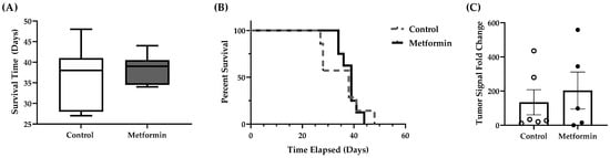 An unpaired Student’s t-test was used to assess baseline body mass between all control and metformin mice. A mixed-effects model (time × treatment) was use to assess normalized body mass between treatment groups and food consumption for the duration of the study. An unpaired Student’s t-test was used to identify any differences in time to caloric intake, signal detection, and length of treatment. Overall survival was determined by a Logrank test. An unpaired Student’s t-test was used to compare differences in gene expression, except where variances significantly differed (p < 0.05). In those cases, a Welch’s t-test was used to compare differences in gene expression between control and treatment animals. Outliers were identified using a Grubb’s test. Significance was established with an a priori alpha value of 0.05. All statistics were completed in GraphPad Prism (Version 9.1, GraphPad Software, San Diego, CA, USA).
