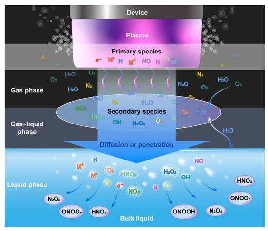 The reactive species seen in PAL is a mixture of oxygen species (O, O3, 1O2, •OH, H2O2, O2•−/•OOH) and nitrogen species (•NO, ONOO− and OONOO−, NO2−, NO3−) [17]. There is an additional interface step with liquid in the radical generation process of PAL, so many efforts regarding the composition ratio, generation process, and source of reactive oxygen and nitrogen species (RONS) have been made to understand the interface step with liquid [18]. In summary, in PAL, RONS is produced in three phases. (1) Gas phase: A radical with a relatively short survival period (1.3–2.7 μs) as a primary species (•OH, •NO, •H, •O, •N) is generated [19]. Because of the high reactivity, they combine with other radicals or with surrounding gases to form secondary species (H2O2, NO2, NO3, O3). (2) Gas–liquid interface: Primary and secondary species react with evaporated H2O from solution to form •OH, O, H, •NO, HNO3, O3, H2O2, HNO2, and so on [20]. (3) Liquid phase: The gaseous radicals dissolve in the solution, and some react with H2O to form ONOOH, N2O5, HNO3, ONOO−, and so on [21,22]. Figure 1 illustrates the formation of RONS during the generation of PAL.