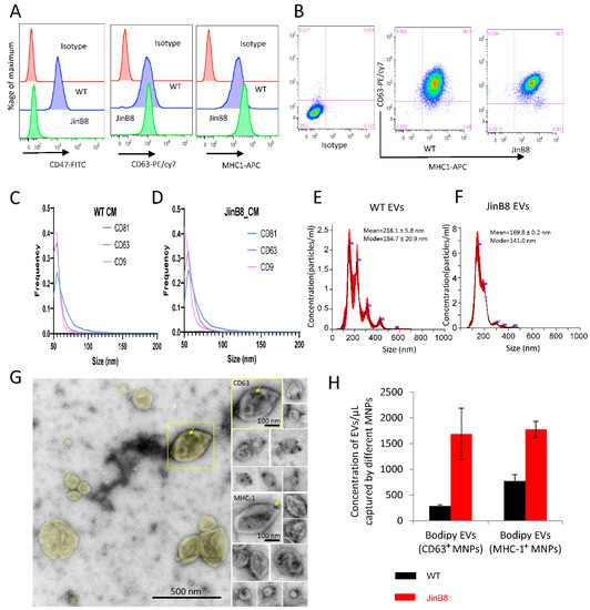 Flow cytometry analysis demonstrated comparable surface expression of CD63 on WT Jurkat and JinB8 T cells, moderately elevated MHC-I levels on JinB8 T cells, and the expected absence of CD47 on JinB8 T cells (Figure 1A,B). The sizes of EVs released in conditioned media from WT Jurkat and JinB8 T cells bearing the EV-associated tetraspanins CD63, CD81, and CD9 were comparable based on NanoView analyses (Figure 1C,D), whereas NanoSight characterization of EVs purified using SEC indicated broader EV size distributions (Figure 1E,F). CD63 and MHC-I associated with EVs was also visualized by negative stain immunogold electron microscopy, which indicated a diverse size and morphologies of CD63+ and MHC-I+ EVs (Figure 1G).