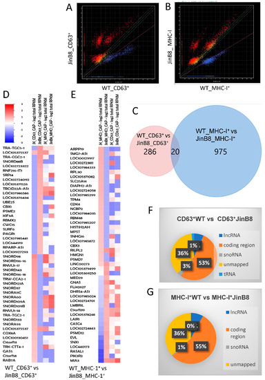 We previously reported the small RNA profiles of CD63+ and MHC-I+ EVs released from WT Jurkat T cells [13]. Small RNA seq analysis was used here to examine the CD47-dependence of the RNA transcripts in CD63+ and MHC-I+ EVs released from WT Jurkat and JinB8 T cells. Using alignment to the whole genome and analyzed as described earlier [13], 306 transcripts exhibited significant differential expression between CD63+ WT Jurkat and CD63+ JinB8 EVs (p < 0.05, Figure 2A), whereas 997 transcripts (995 mapped) exhibited differential expression between MHC-I+ WT Jurkat and JinB8 EVs (p < 0.05, Figure 2B). Remarkably, a Venn diagram analysis showed that only 20 CD47-dependent transcripts were shared between MHC-I+ and CD63+ EVs (Figure 2C). Many of the most CD47-dependent enriched or depleted transcripts in both EV types were noncoding RNAs (Figure 2D,E), although a global comparison revealed that a majority of the CD47-dependent transcripts represent protein coding mRNAs (Figure 2F,G).