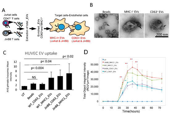 (A) Protocol for assessing HUVEC responses to MHC-I+ and CD63+ EVs from WT Jurkat vs. JinB8 cells. The respective EVs were pulled down using streptavidin magnetic nanobeads bearing CD63-biotin or MHC-I-biotin antibodies. (B) The nanobeads alone and captured EVs were visualized by negative stain EM. Arrows indicate nanobeads. (C) EVs labeled with pHrodo dye were captured, washed, and incubated with HUVEC for 24 h. HUVEC uptake was quantified using cell image Cytometry Celigo. (D) Kinetics of EV uptake by HUVEC were measured using Incucyte Live cell imaging analysis (n = 6 replicates per experiment, and two biological experiments). Significance was assessed using Student’s t test. For WT Jurkat CD63+ vs. WT Jurkat MHC-I+ EVs. Asterisk colors indicate significance of the corresponding line graphs (*) with p values significant at 24 h (0.03) and 30 h (0.04), and for JinB8 CD63+ vs. JinB8 MHC-I+ EVs from 24–42 h (0.0006, 0.002, 0.001, 0.002) respectively. No significant p values were observed between WT Jurkat MHC-I+ vs. JinB8 MHC-I+ EVs or WT Jurkat CD63+ versus JinB8 CD63+ EVs.