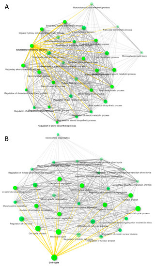 Immunocaptured CD63+ and MHC-I+ EVs released from WT Jurkat T cells were co-cultured with HUVEC for 3 days. Differential gene expression of HUVEC untreated vs. CD63+ EV or MHC-I+ EV treated HUVEC was determined using microarray analysis. (A) GO enrichment pathway network of untreated HUVEC vs. cells treated with WT Jurkat CD63+ EVs (>1.5 ± fold change, p ≤ 0.05). (B) GO enrichment pathway network of untreated HUVEC vs. cells treated with WT Jurkat MHC-I+ EVs (>1.5 ± fold change, p ≤ 0.05). Supplemental Materials Data files related with (A,B); Data/s2A, /Data/s2B, /Data/s2C.