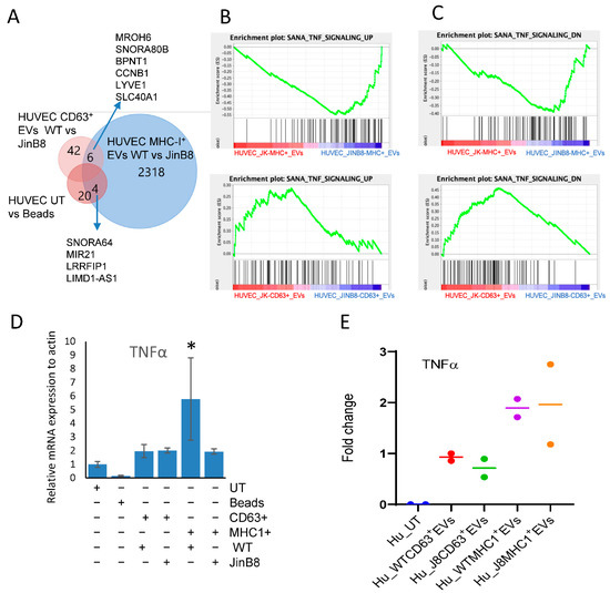 Immunocaptured CD63+ and MHC-I+ EVs as in Figure 3A were co-cultured with HUVEC for 3 days, and differential mRNA expression was evaluated using microarray analysis. (A) Venn diagram showing comparative analysis of CD47-dependent transcripts (p < 0.05) in HUVEC treated with beads alone or treated with CD63+ or MHC-I+ EVs from WT Jurkat or JinB8 T cells. (B,C) Geneset enrichment analysis plots showing enrichment of a TNF signaling signature in HUVEC treated with CD63+ EVs from WT Jurkat vs. JinB8 T cells (B) or MHC-I+ EVs from WT Jurkat vs. JinB8 T cells (C). (D) TNFα mRNA expression was validated via real-time PCR with ß-actin as control (1 biological replicate). (E) The increase in fold change of secreted TNFα in conditioned medium from HUVEC treated with the indicated EVs for 3 days. Secreted TNFα was undetectable from supernatant of untreated HUVEC cells, but control bead-treated sample had background values. Therefore, results are presented as fold change with respect to background value (n = 2). Supplemental Data files related with Figure 5; /Data/s3A, /Data/s3B, /Data/s2C. * p < 0.05.