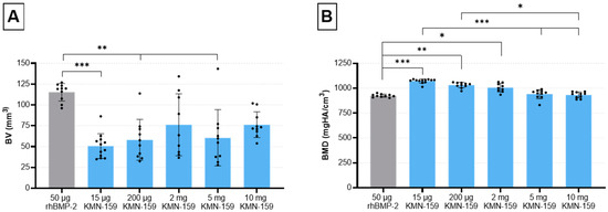 Accordingly, bone mineral density (BMD) was also significantly influenced by the type of scaffold (p = 0.0001). Highest BMD values could be observed for the low and middle dose KMN-159 groups which was significant when compared to 50 µg rhBMP-2 (15 µg: p < 0.0001; 200 µg: p < 0.01; 2 mg: p < 0.05). For the 2 high dose KMN-159 groups (5 mg and 10 mg), BMD values were comparable to that of 50 µg rhBMP-2.