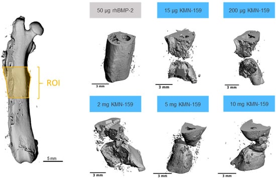 Taken together, in this study, we could show a dose–dependent osteoregenerative effect of KMN-159 with reaching its maximum at 2 mg while higher concentrations did not lead to increased bone defect healing. The hypothesis stated at the beginning of this study—that KMN-159 would show a significant bone regenerative potential in a critical-sized femoral bone defect model in rats—was confirmed. The osteoregenerative potential demonstrated in our study, together with its chemical stability, good pharmacological properties, and its inability to induce unwanted ectopic bone formation [31], make KMN-159 a promising alternative to rhBMP-2. Nevertheless, further work is needed to find the optimal dose of KMN-159 required for sufficient bone healing in different bone defect models while exhibiting minimal or no adverse side effects. In addition, as has been done for other locally acting therapeutics, an optimal carrier material for KMN-159 must be established.