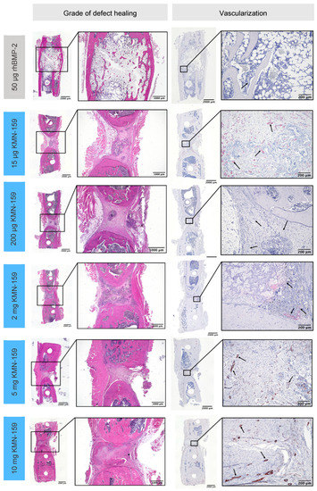 The number of vessels in the defect area (Figure 6A) was highest for 15 µg KMN-159 which was significant compared to 50 µg rhBMP-2 (p < 0.0001), 200 µg KMN-159 (p = 0.0372) and 2 mg KMN-159 (p = 0.0045). Animals treated with 50 µg rhBMP-2 showed the lowest degree of vascularization, followed by middle and high dose KMN-159. Compared to the number of vessels found in 15 µg KMN-159 samples, they were reduced to 12–15% when middle dose KMN-159 (200 µg, 2 mg) and to 19–22% when high dose KMN-159 (5 mg, 10 mg) was applied. The lowest number of vessels was detected in rhBMP-2 treated samples.