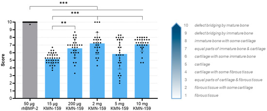 The grade of defect healing was determined based on the score established by Huo et al. [23] (Figure 5, Table 3). Consistent with the bone volume results, the drug loaded onto the scaffold significantly influenced the grade of defect healing (p < 0.0001). The lowest degree of defect healing was observed for animals treated with 15 µg KMN-159 (equivalent to previous negative controls) and the 200 µg KMN-159 (p < 0.01). The 2 mg KMN-159 and the 10 mg KMN-159 groups (both p < 0.0001) all showed significantly increased bone healing in comparison. As expected, treatment with a high dose (50 µg) rhBMP-2 led to the highest degree of defect healing (= defect bridging with mature bone), which was significant compared to all other groups (p < 0.0001).