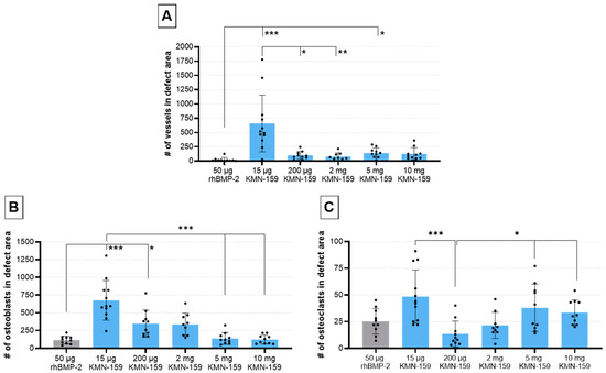 As for osteoblasts, the highest numbers of osteoclasts (Figure 6C) were found in the 15 µg KMN-159 group followed by 5 mg and 10 mg KMN-159, 50 µg rhBMP-2, 2 mg and 200 µg KMN-159. Therefore, significant differences were found between 200 µg KMN-159 and 15 µg KMN-159 (p = 0.0005), 5 mg KMN-159 (p = 0.0486) and 10 mg KMN-159 (p = 0.0328).