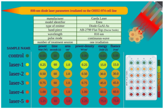 - Shirazian, S.; Keykha, E.; Pourshahidi, S.; Ebrahimi, H. Effects of 660 nm and 810 nm Low-Power Diode Laser on Proliferation and Invasion of Oral Cancer Cells in Cell Culture Media. Photochem. Photobiol. 2020, 93, 618–626. [Google Scholar] [CrossRef] [PubMed]
