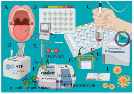 Experimental design outlining the various outcomes assessed after PBM treatments. Cancer cell line from human tongue squamous cell carcinoma (A) was transferred into a black 24 well plate with a flat and clear bottom (B). PBM therapy was administered through the 810-nm laser (C). After treatments, cells are processed to evaluate the variation of the energetic metabolism such as ATP synthesis (D), oxygen consumption (E), OxPhos efficiency, lactic acid production and oxidative stress (F). Markers regulating apoptosis (G) and cell cycle and viability (H,I) were also detected.