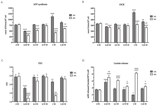 Glucose metabolism modulation in OHSU-974 FAcorr cells after 808-nm laser irradiation. (A) ATP synthesis through FoF1-ATP synthase; (B) the oxygen consumption rate (OCR). For both graphs, data are obtained in the presence of pyruvate plus malate as respiring substrates. (C) P/O value, calculated as the ratio between the synthesized ATP and the consumed oxygen. (D) Lactate release in the growth medium. In each graph, grey and white columns represent the data obtained 24 or 48 h after the laser irradiation, respectively. Data are reported as mean ± SD, and each graph is representative of at least three independent experiments. Statistical significance was tested by a two-way ANOVA. *, **, ***, and **** represent p < 0.05, 0.01, 0.001, and 0.0001, respectively, between the treated sample and the untreated sample (0 W) used as control, at the same time after irradiation. #, ##, ###, and #### represent p < 0.05, 0.01, 0.001, and 0.0001, respectively, between the values obtained after 24 h and 48 h from the laser irradiation in the sample treated with the same laser power.