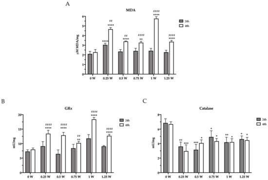 Lipid peroxidation and modulation of enzymatic antioxidant defenses in OHSU-974 FAcorr cells after 808-nm laser irradiation. (A) Malondialdheyde (MDA) level. (B) Glutathione reductase (GRx) activity. (C) Catalase activity. In each graph, grey and white columns represent the data obtained 24 or 48 h after the laser irradiation. Data are reported as mean ± SD, and each graph is representative of at least three independent experiments. Statistical significance was tested by a two-way ANOVA. *, **, *** and **** represent p < 0.05, 0.01, 0.001 and 0.0001, respectively, between the treated sample and the untreated sample (0 W) used as control, at the same time after irradiation. ## and #### represent p < 0.05, and 0.0001, respectively, between the values obtained after 24 h and 48 h from the laser irradiation in the sample treated with the same laser power.