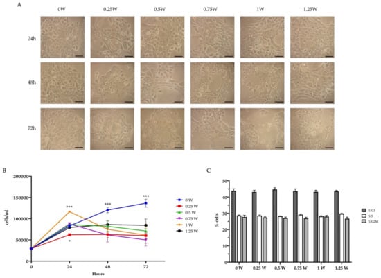 In addition to altering glucose metabolism, PBM treatments affected the OHSU-974 FAcorr viability. In detail, 24 h after the irradiation, 0.25 and 1 W determined a decrement and an increment in the cell number, respectively, compared to the control and the other treated samples (Figure 5A,B). However, after 48 and 72 h from the laser irradiation, all treated samples showed a significant decrement in the cell number compared to the control (Figure 5A,B). Moreover, cell morphology analysis showed the presence of several apoptotic bodies (Figure 5A). However, cell cycle analysis noted a similar pattern, indicating surviving cancer cells were not dormant or growth-arrested (Figure 5C).