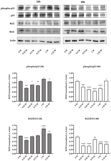 To confirm the activation of the apoptotic process in the lasered OHSU-974 FAcorr cells, the expression of phospho-p53, p53, Bcl2, and Bax has been evaluated, by western blot. Data show that in the first 24 h after the laser irradiation, the p53 phosphorylation appeared impaired only in 0.25, 0.5, and 0.75 W cells, while other samples displayed an expression level similar to that of the control. Conversely, after 48 h of laser irradiation, all samples except the one treated at 1.25 W showed the impairment in the activation of p53, suggesting a minor ability to check the DNA damage (Figure 6). The evaluation of the expression of anti-apoptotic Bcl2, the pro-apoptotic Bax, and their ratio show that at 24 h after the laser treatment only in 0.25 W sample the equilibrium was unbalanced towards the apoptosis activation. Conversely, 1 W and 1.25 W seem to have a diametral effect, increasing the Bcl2/Bax ratio. Forty-eight hours after the irradiation, all the treated samples show a sharp decrement of the Bcl2/Bax ratio, suggesting an activation of the apoptotic pathway (Figure 6), and confirming the morphological data reported in Figure 5.