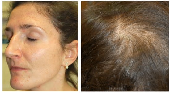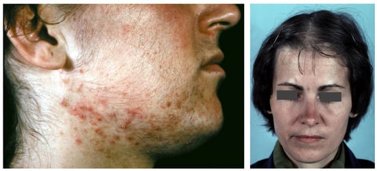 - Zouboulis, C.C.; Achenbach, A.; Makrantonaki, E. Acne tarda and male-pattern baldness unmasking primary ovarian insufficiency: A case and review. Dermatology 2014, 229, 51–54. [Google Scholar] [CrossRef]
