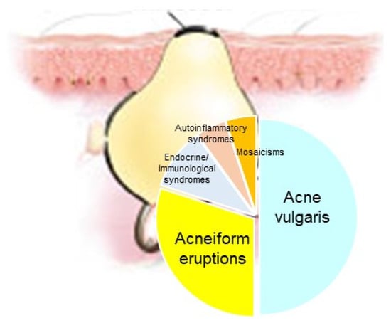 Acne represents a cardinal skin manifestation in several groups of diseases, such as acne vulgaris, acneiform eruptions (acneiform dernatoses), endocrine/immunological syndromes, autoinflammatory syndromes and certain mosaicisms.