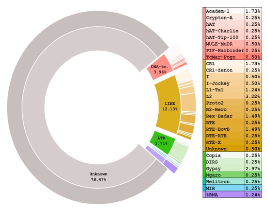 As a result of the RepeatModeler + RepeatMasker pipeline run, we found that 44% of the urchin genome was occupied by repeats, and most of them (78.74%) belonged to previously unknown families. Currently, the classification of RE is too complicated due to the limited number of well-assembled genomes. The DFAM consortium continuously develops new approaches to classification and updates consensus sequences of REs. Our result agrees in general with the result of the authors of the latest S. purpuratus 5.0 genome assembly. Using the alternative WindowMasker pipeline, they masked 39% of the genome. It is noteworthy that a masked portion in the genome is not a good subject to compare between different taxa because the percentage of ncDNA varies greatly even between neighboring species [79]