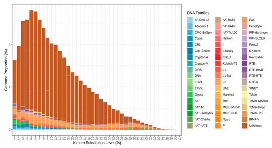 As previously unknown repeats occupy most of the genome of sea urchin, their portion in any of the bars would be the largest one. From the shape of the bar plot, we can conclude that the majority of the repeats do not actively replicate in the genome. If the TEs were actively jumping, the distribution peak would shift to the left. In this species, it is highly likely that repeats have undergone active expansion in the near past. This assumption is correct for the Class II TEs and for those unknown. In contrast, DNA transposons have maximum abundance at the 1% level, and this can indicate that they are expanding in modern S. purpuratus.