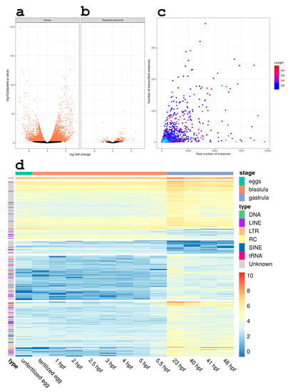 RE expression significantly changes during the gastrulation process irrespective of their origin and number of copies. Volcano plot showing differential expression of gene-coding transcripts (a) and RE (b) between blastula and gastrula stages. Each transcript is shown as a single point. Those with significantly changed levels are orange; black points are those without significant changes in transcription. (c) Scatter plot of expressed repetitive elements. X-axis represents the copy number of a given RE in the genome. Y-axis represents the number of transcribed copies of this element. Color gradient from blue to red indicates the length of the element. RE families with the length > 500 bp are shown with cyan dots. (d) Heat map of repetitive elements transcription that are differentially expressed during the gastrulation by embryo stages. Type column denotes the RE type. Class row denotes the embryo stage. Top 500 elements by their logFC were selected for this plot.