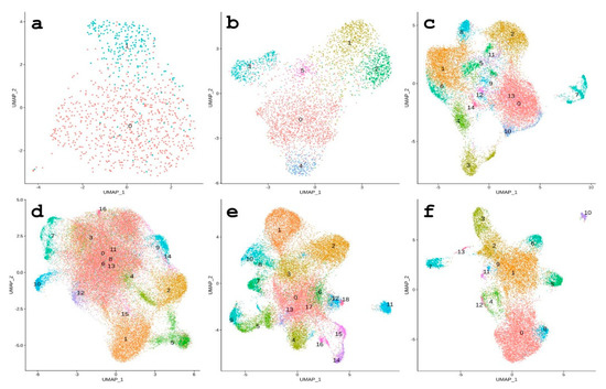 Results of the single-cell RNA-seq analysis. Umap plots of each embryo stage separately. (a) 64-cell embryo; (b) morula stage; (c) hatched blastula; (d) mesenchyme blastula; (e) early gastrula; (f) late gastrula.