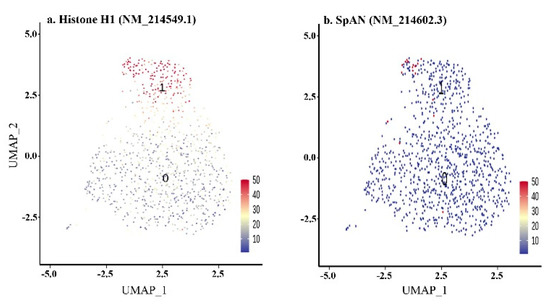 An embryo reached the number of 60 cells at approximately 5 h post fertilization, depending on the water temperature. The cell cycle duration was around 30 min and the blastomere divisions were still synchronized. However, there was clear segregation between the animal and vegetal hemispheres. Therefore, there were two distinguishable clusters at the 64-cell stage (Figure 4a). Cluster 1 was highly likely to be the animal pole of the embryo based on marker expression—Histone H1 (Figure 5a, Supplementary Table S1). The animal pole undergoes more intense cell divisions than a vegetal one, that is why histones marked this population. Several cells expressing the SpAN gene, known to be the marker of animal–vegetal polarity, could also be observed in cluster 1 (Figure 5b).
