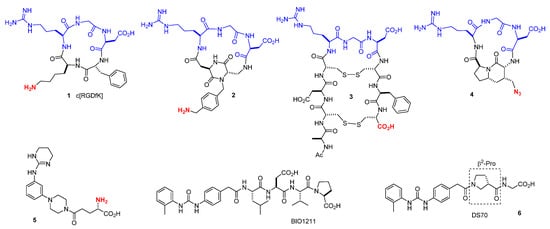 Examples of RGD peptide (1–4) or peptidomimetic (5) integrin ligands recognized by integrins expressed on cancer cells (e.g., αvβ3, α5β1). Functional groups exploitable for peptide conjugation are rendered in red. The α4β1-integrin selective antagonist BIO1211 contains the LDV binding motif and a diphenylurea moiety. The α/β-hybrid DS70 (6), designed as an analogue of BIO1211, includes a central β2-Pro scaffold.