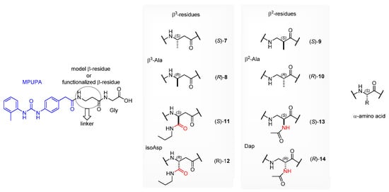 Moving from the α/β-hybrid lead 6 (Figure 1), we designed a series of analogues (Figure 2) containing diverse β-amino acid cores, while maintaining glycine as the C-terminal residue and the diphenylurea moiety MPUPA (Figure 2). The mini-library of β-residues included model homo β2- or β3-amino acids in (S)- or (R)-configuration, i.e., β3-Ala (peptides 7, 8) or β2-Ala (9, 10), as well as (S)- or (R)-configured β3- or β2-residues carrying side chain functional groups exploitable for expedient connections, i.e., isoaspartate (isoAsp, 11, 12), or 2,3-diamino propionic acid (Dap, 13, 14), respectively.
