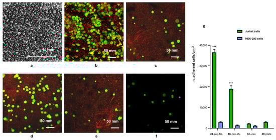 (a) SEM image of IC–zeolite ML. Cell adhesion to peptide monolayers: (b–f) confocal microscopy images of monolayers after 15 min incubation at 37 °C with 5 × 105 cells; (b) Jurkat cells adhered to 49–zeolite ML; (c) HEK-293 cells adhered to 49–zeolite ML; (d) Jurkat cells on 50–zeolite ML; (e) Jurkat cells on BA–zeolite ML; (f) Jurkat cells on 49-plate; (g) Number of adhered cells/cm2 (analyzed area: 0.0025 cm2); data are shown as mean ± SD of three independent experiments. *** p < 0.001 vs. HEK-293 seeded onto peptide-zolite ML. Cells are visualized in green, while zeolites are visualized in red.