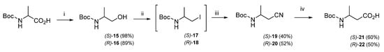 Due to poor stability under the common separation and purification procedures, the iodoamino intermediate was used directly without isolation. The subsequent displacement of iodine with potassium cyanide led to (S)-19 or (R)-20, and the final hydrolysis gave Boc-β3-homoAla-OH (S)-21 or (R)-22 (Scheme 2). The risk of racemization was excluded by HPLC on a chiral column and polarimetry, as reported [43].