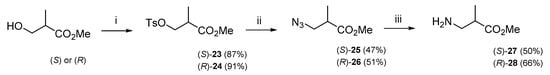 The enantiopure model residue (S)- or (R)-β2-Ala was synthesized as methyl ester by a modified version of a multi-step procedure previously reported by Lee et al [44]. Tosylation of (S)- or (R)-β-hydroxy ester provided (S)-23 or (R)-24 in good yield, 87% and 91%, respectively (Scheme 3). The tosylate was treated with NaN3 in N,N-dimethylformamide (DMF) to afford the corresponding azide (S)-25 or (R)-26. Finally, the catalytic reduction of the crude azide with H2 and the catalytic amount of Pd/C gave the primary amine (S)-27 or (R)-28.