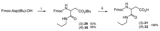 As anticipated (Figure 2), to introduce a central β3-homo residue possessing an extra anchoring point, we selected (S)- or (R)-isoaspartate (isoAsp). The carboxylic acid of isoAsp can be utilized to connected useful linkers by straightforward reactions (Figure 2). To mimic such linkers, the α carboxylic group of (S)- or (R)-Fmoc-Asp(OtBu)-OH was reacted with a simple n-propylamine using 1-ethyl-3-(3-dimethylaminopropyl)carbodiimide.HCl (EDC)/hydroxybenzotriazole (HOBt)/triethylamine (TEA) as activating agents, giving the fully protected 29 or 30. Subsequent tBu-deprotection with trifluoroacetic acid (TFA) afforded Fmoc-isoAsp(NHPr)-OH (S)-31 or (R)-32 (Scheme 4 and Supplementary Materials).