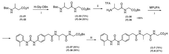 Synthetic procedure for MPUPA-β3-homoAla-Gly-OH, (S)-7, (R)-8. Reagent and conditions: (i) EDC/HOBt, TEA, DCM/DMF, rt, 12 h; (ii) 25% TFA/DCM, rt, 1 h; (iii) H2, Pd/C, EtOH, rt, 12 h.