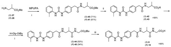 Synthetic procedure for MPUPA-β2-homoAla-Gly-OH, (S)-9, (R)-10. Reagent and conditions: (i) TBTU, HOBt, DIPEA, DCM/DMF, rt, 12 h; (ii) LiOH, THF/H2O, 0 °C, rt, 2 h, then 0.1 N HCl; (iii) TFA/DCM, rt, 1 h.
