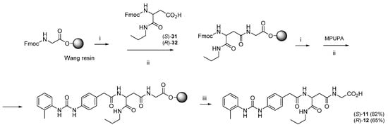 Synthetic procedure for MPUPA-isoAsp(NHPr)-Gly-OH, (S)-11, (R)-12. Reagent and conditions: (i) 20% Pip/DMF, rt, 10 min (×2); (ii) DCC, HOBt, DCM/DMF, rt, 3 h; (iii) TFA/H2O/TIPS/PhOH (78:10:10:2 v/v/v/v), rt, 2.5 h.