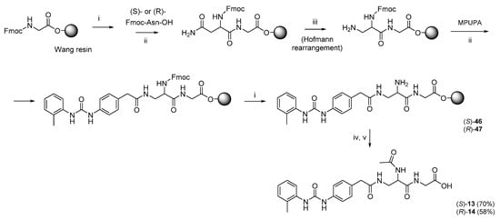 Finally, (S)-13 or (R)-14 were assembled by SPPS on a Wang resin preloaded with Fmoc-Gly (Scheme 8). After removal of Fmoc group with 20% Pip/DMF, Fmoc protected (S)- or (R)-Asn-OH was activated for coupling with (S)- or (R)-Fmoc-Asn-OH in the presence of DCC/HOBt. The Hofmann rearrangement of the primary amide of Asn into the corresponding amine was performed on resin using PhI(OCOCF3)2 (PIFA) and pyridine in DMF/H2O [45]. The resulting Nα-Fmoc-Dap residue was coupled at the β-amino group with MPUPA under the same conditions described above.