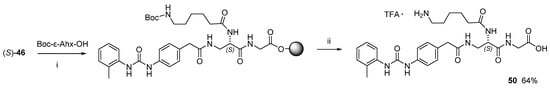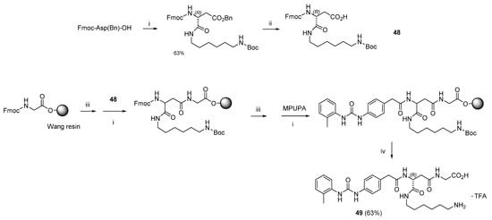 MPUPA-(R)-isoAsp(Hda)-Gly-OH.TFA 49. Peptide 49 was prepared in SPPS, as reported for peptide 12, on a Wang resin preloaded with Fmoc-Gly (0.15 mmol). In brief, Fmoc cleavage was carried out with 20% Pip/DMF. Then, Fmoc-(R)-isoAsp(Boc-Hda)-OH (48, 0.3 mmol, Supplementary Materials) and MPUPA (0.3 mmol), were coupled in sequence in the presence of HOBt/DCC (0.36 mmol each). After the usual work up, the cleavage of the peptide from the resin was performed with TFA/TIPS/H2O/PhOH (78:10:10:2 v/v/v/v, 10 mL). Purification by semipreparative RP HPLC (general methods) gave 49 (63%, 97% pure). Purity was assessed by analytical RP HPLC (general methods); Rt = 1.9 min. 1H NMR (400 MHz, DMSO-d6) δ 9.09 (s, 1H, ureaNH), 8.68 (br.t, 1H, GlyNH), 8.14 (d, J = 8.0 Hz, 1H, isoAspNH), 8.02–8.12 (m, 3H, NH3+), 8.02 (s, 1H, ureaNH), 7.82 (d, J = 8.4 Hz, 1H, ArH6), 7.62 (br.t, 1H, CONH), 7.37 (d, J = 8.4 Hz, 2H, ArH2′6′), 7.10–7.18 (m, 4H, ArH3,5 + ArH3′5′), 6.93 (t, J = 7.2 Hz, 1H, ArH4), 4.50 (m, 1H, isoAspHα), 3.73 (d, J = 5.6 Hz, 2H, GlyHα), 3.58–3.62 (m, 2H, CH2), 3.30–3.40 (m, 4H, PhCH2 + CH2), 2.70–2.78 (m, 2H, CH2), 2.60 (dd, J = 14.8, 6.4 Hz, 1H, isoAspHβ), 2.45 (dd, J = 15.2, 7.6 Hz, 1H, isoAspHβ), 2.23 (s, 3H, ArCH3), 1.63 (m, 1H, CH2), 1.55–1.55 (m, 3H, CH2), 1.35–1.40 (m, 2H, CH2), 1.20–1.25 (m, 2H, CH2). 13C NMR (100 MHz, DMSO-d6) δ 171.6, 171.2, 170.9, 170.1, 153.2, 137.9, 130.6, 129.8, 126.5, 123.0, 121.6, 118.3, 50.3, 44.1, 41.1, 38.7, 29.1, 26.1, 25.9, 22.6, 22.0, 18.2, 15.6. ESI-MS m/z calculated for (C28H39N6O6)+: 555.3, found: 555.4 (M + H)+.